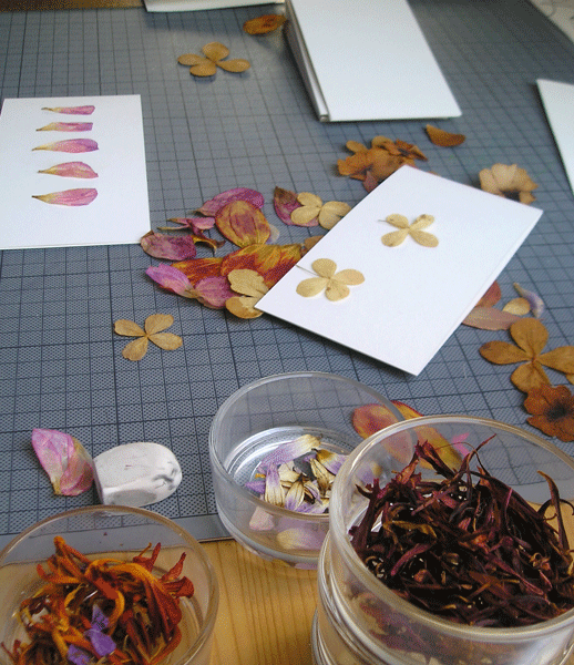Die gepressten Blütenblätter werden partiell mit einem natürlichen Reiskleber auf die Karte aufgebracht.