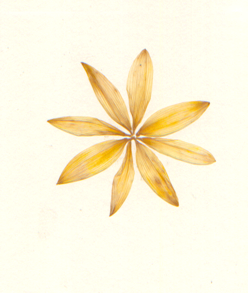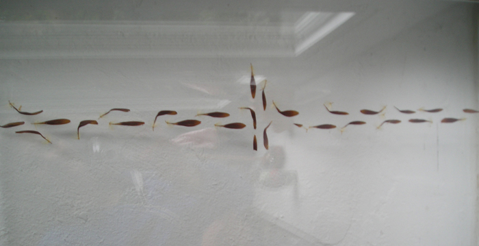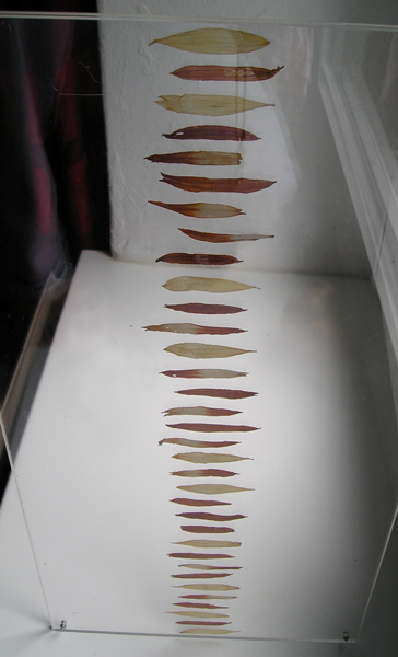 Durch das Pressen der Pflanzen wurde der Zersetzungsprozess fast zum Erliegen gebracht, aber die Sonnen - und Lichteinwirkung verändert die Blütenblätter weiterhin - je nach Intensität. Die Farben und die Struktur der Blüten verwandeln sich, und mit ihnen das gesamte Bild - über Jahre hinweg.