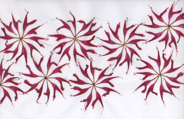 Ich fertige auch Bilder (Format 25 x 50 cm) aus Blütenblättern an – zwischen zwei Acrylglasplatten - so dass das Licht hindurchscheinen kann.