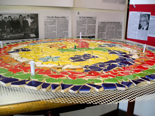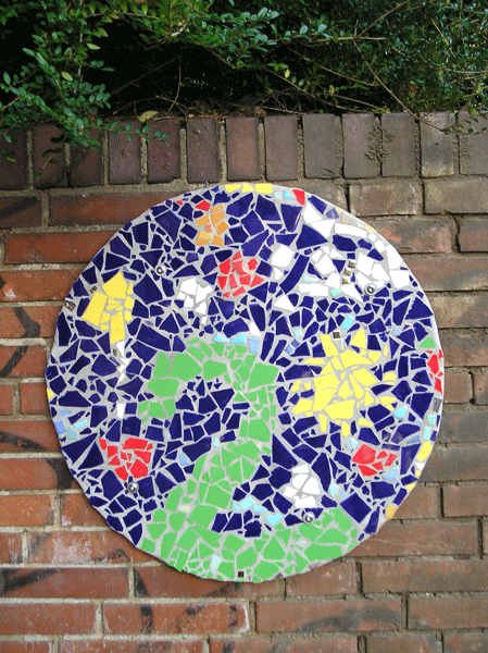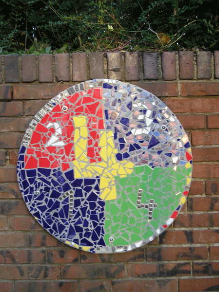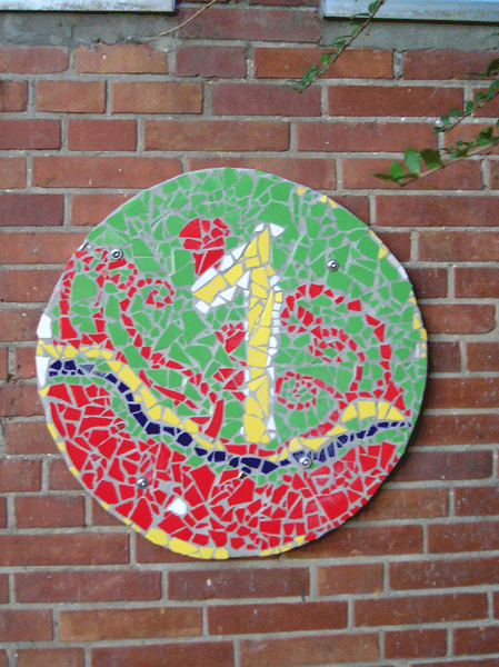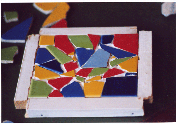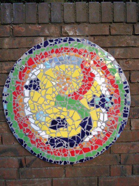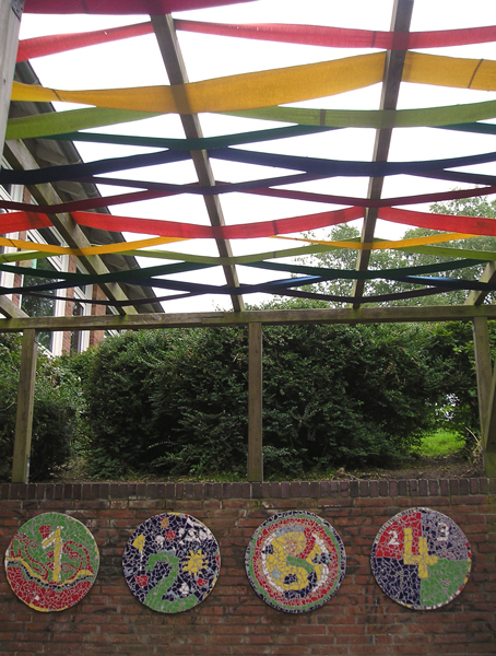 Die Mosaiksteine wurde mit dem Hammer aus Kacheln selbst hergestellt und nach ihren Entwürfen von den Kindern, als Mosaik zusammengesetzt. Danach habe ich sie auf Hartfaserplatten geklebt. Die Mosaike werden an der Außenwand auf dem Schulhof angebracht. Dazu kommt ein „Flechtdach“ aus farbigen, witterungsbeständigen Stoffstreifen.