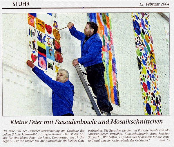 Das Projekt - Ich in meiner Gruppe in unserem "Haus für Kinder, Jugend und Kultur" beschäftigt sich mit der Selbstwahrnehmung in den verschiedenen Gruppen, in die jeder Mensch eingebunden ist. Es wurde von meiner Kollegin entwickelt und gemeinsam umgesetzt. Alle Nutzer des Gebäudes der alten Schule in Brinkum – die Kunstschule KuSS, das Jugendzentrum, die Medienwerkstatt und ein Nachhilfe Verein wurden in verschiedenen Kunstaktionen eingebunden und zusammengeführt. Die entstandenen Ergebnisse (acht Mosaike und fünf großformatige Banner) wurden an der Außenfassade des Gebäudes angebracht.