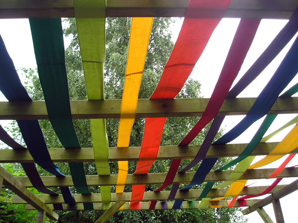 Die Stoffe gestalten den Schulhof fröhlicher und bewegter, die Mosaike werden noch hinzukommen.