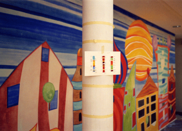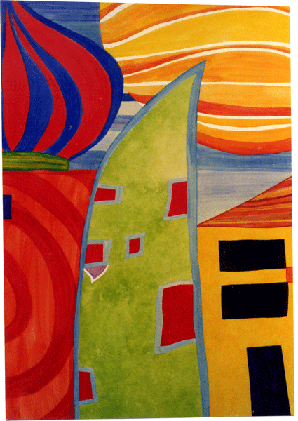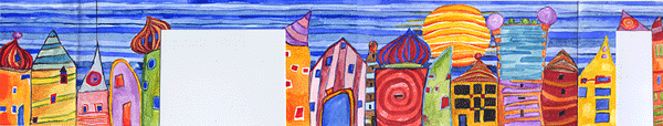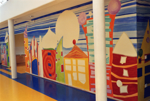 Das Wandbild zum Thema "Die Häuser des Künstlers Hundertwasser" habe ich, zusammen mit einer Kollegin, über mehrere Wochen umgesetzt